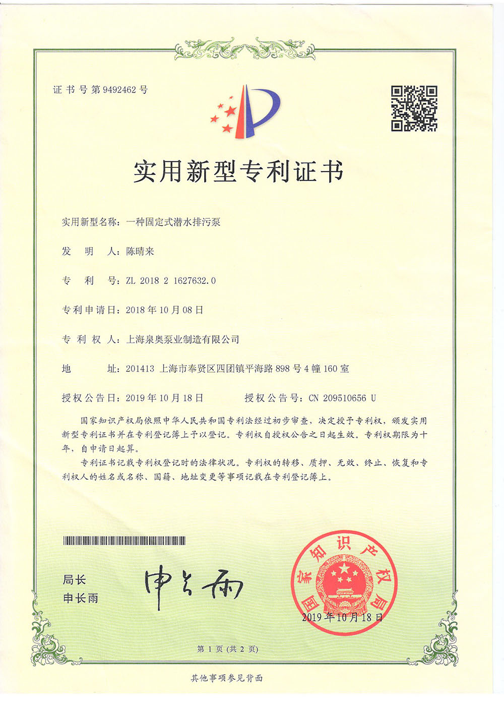 实用型专利证书